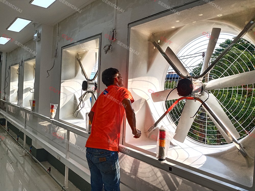 พัดลมระบายอากาศโครงไฟเบอร์กลาสชนิดมอเตอร์ขับโดยตรง 7 ใบพัด ปริมาณอากาศ 38,000 m3/h กำลังไฟฟ้า 380 Vol./1500 watt/ 50 hz.