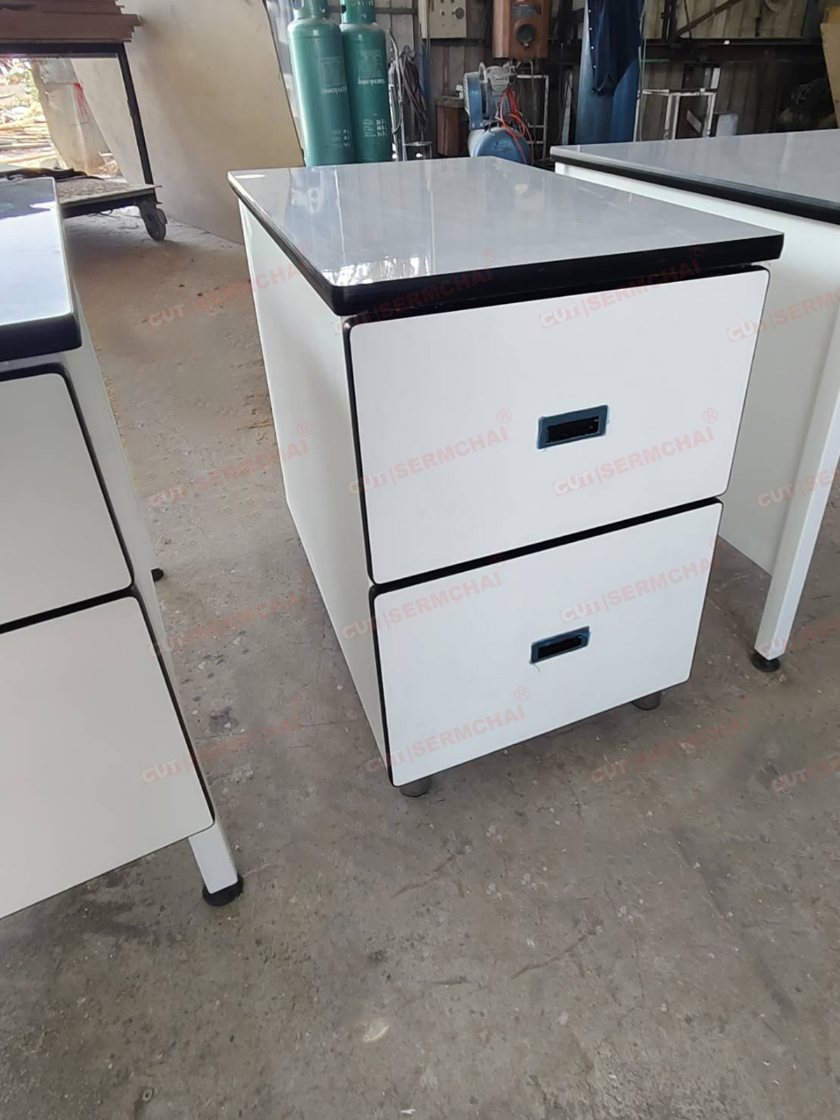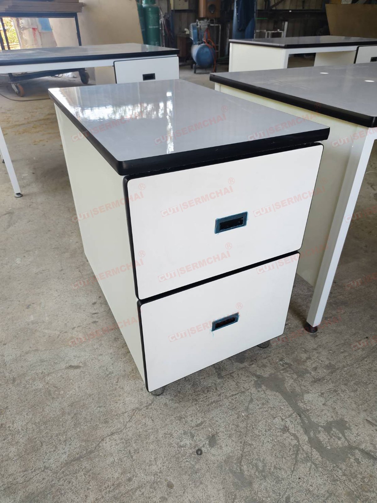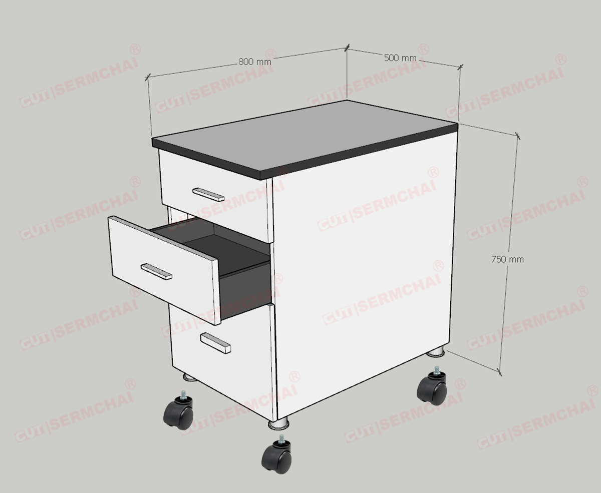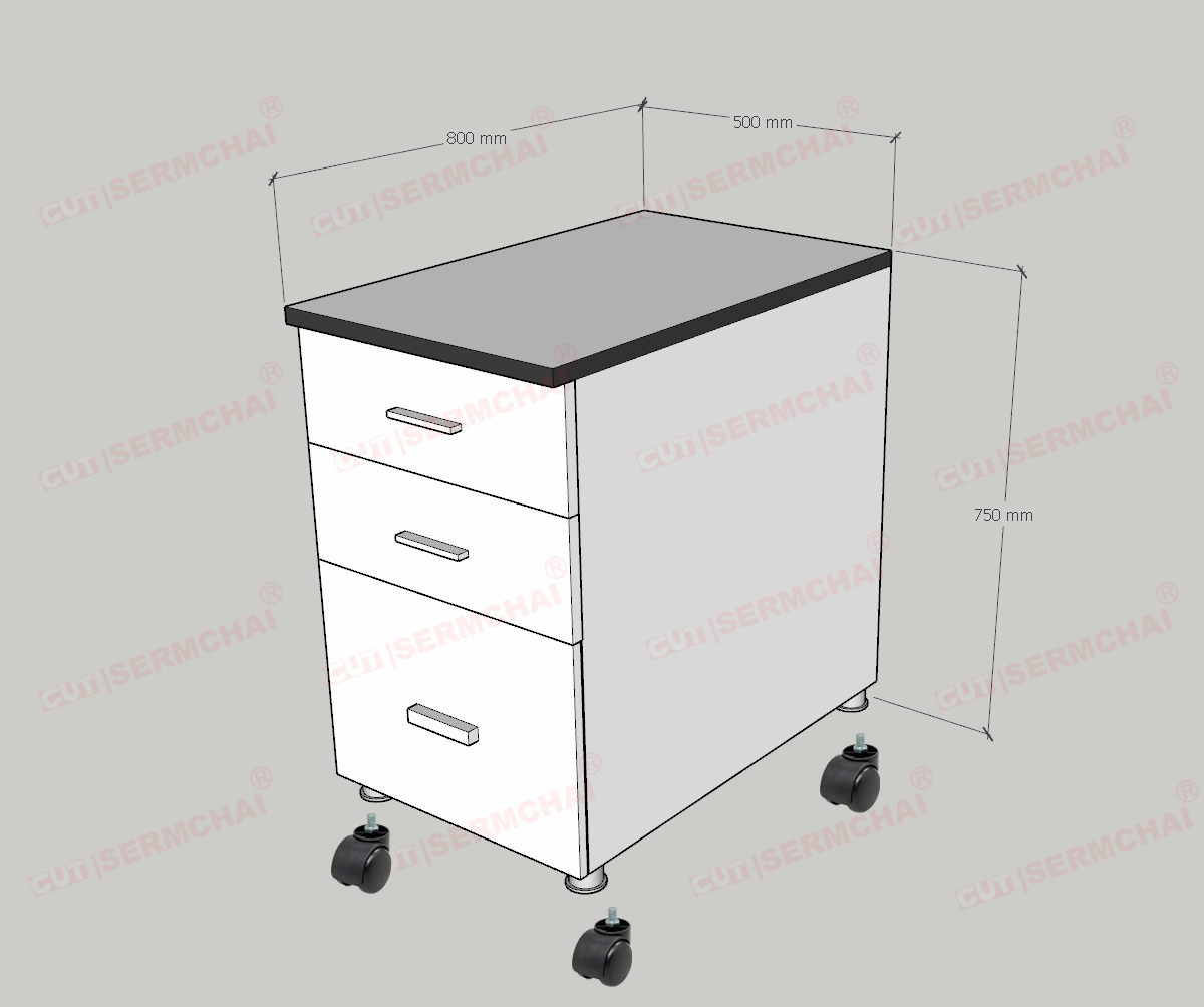 ตู้ลิ้นชักอนกประสงคฺ 3 ชั้น โครงสร้างเป็นไม้ สีขาวตัดสีดำผิวเนิ้อไม้ด้านบนเป็นขาวเงา-สวย เหมาะสำหรับวางข้างโต๊ะทำงาน