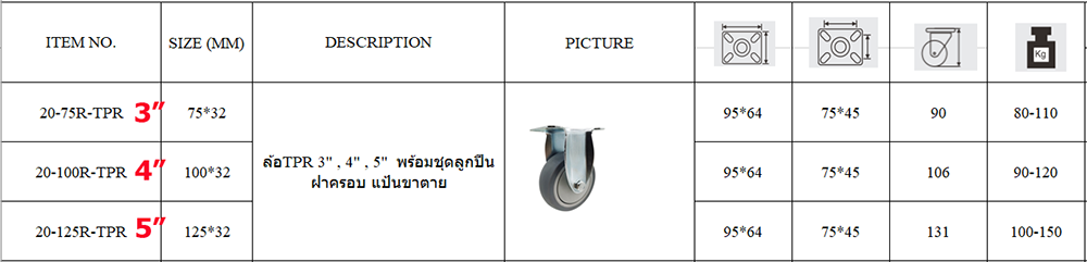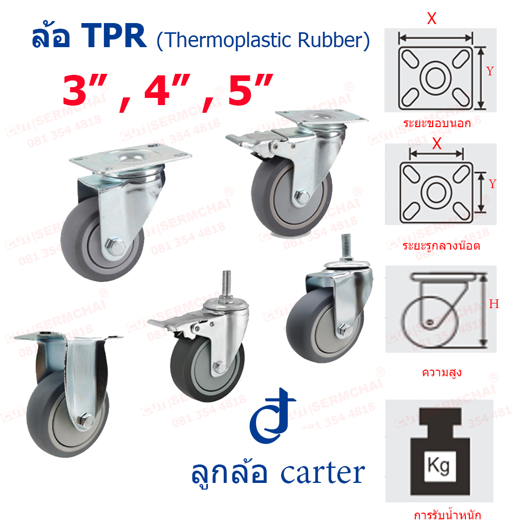 ล้อ TPR ล้อยางสังเคราะห์คุณภาพสูงที่ผสมผสานความยืดหยุ่นของยางเข้ากับความทนทานของพลาสติก มีคุณสมบัติเด่นคือเข็นลื่น เงียบ ไม่ทำลายพื้นผิว ทนต่อการสึกหรอ และทนอุณหภูมิได้ตั้งแต่ -45°C ถึง 90°C เหมาะสำหรับรถเข็นงานโรงงาน โรงแรม โรงพยาบาล, เฟอร์นิเจอร์, งานทางการแพทย์ และการใช้งานในร่ม